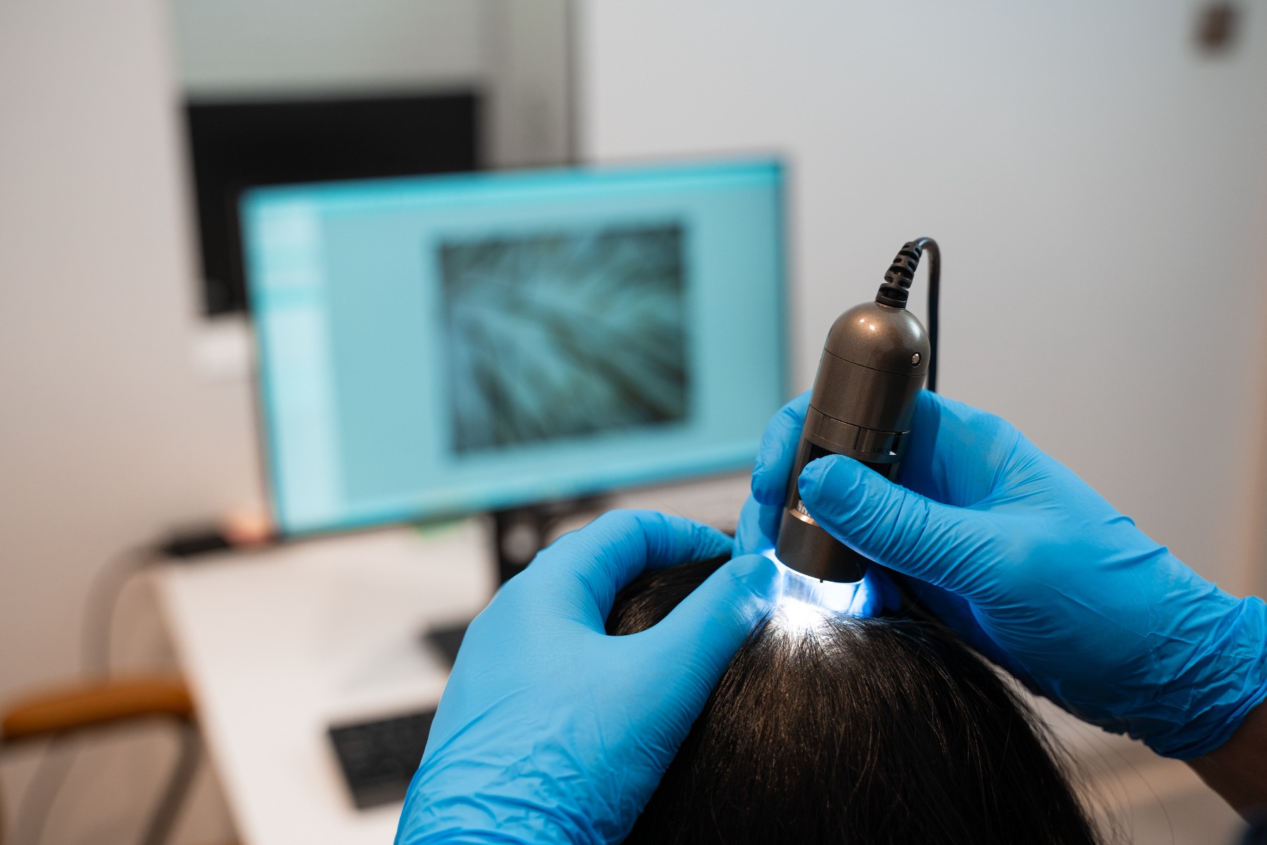 Under en trichologisk konsultation undersøges hovedbunden og hårsækkene ved hjælp af forstørrelse for at vurdere hovedbundens tilstand og hårets tæthed.
